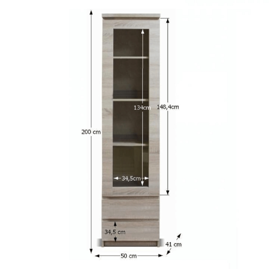 Vitrín egyajtós, két fiókos, TYP 04. Anyag: laminált DTD, ABS élek. Szín: tölgyfa sonoma. Méretek SzéxMéxMa: 50x41x200 cm. Összeszerelve szállítjuk