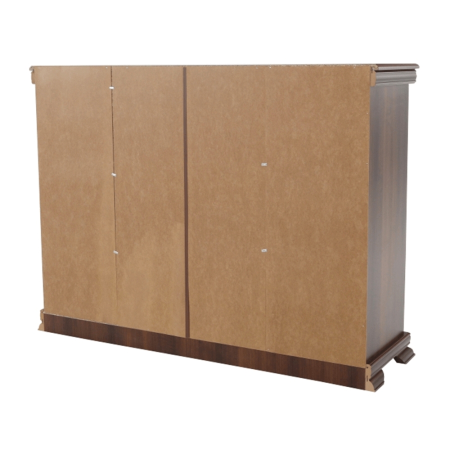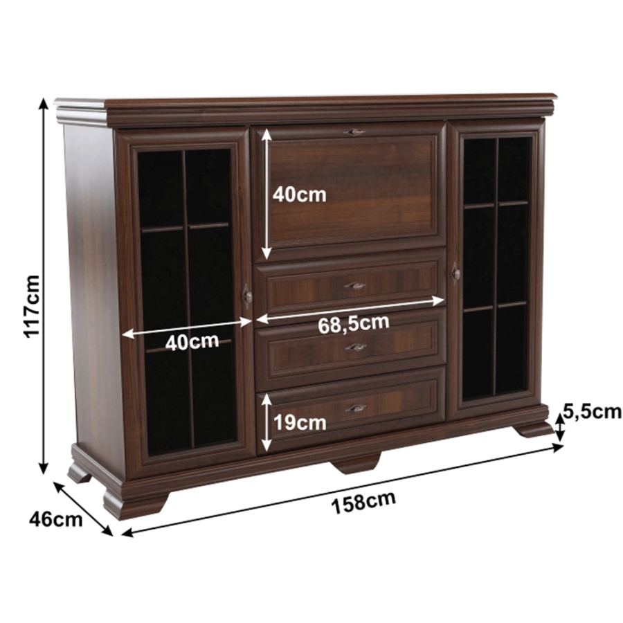 Vitrin bárszekrénnyel, KORA KK6 Színváltozat: samoa king Anyag: laminált DTD/MDF/fém/üveg Méretek (SzéxMéxMa): 158x46x117 cm Váz vastagsága: 15 mm Felsőlap vastagsága: 22 mm Alsólap vastagsága: 22 mm Az alsó tér magassága a padlótól: 10,5 cm