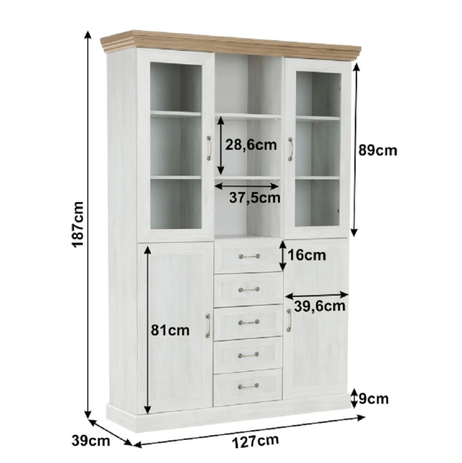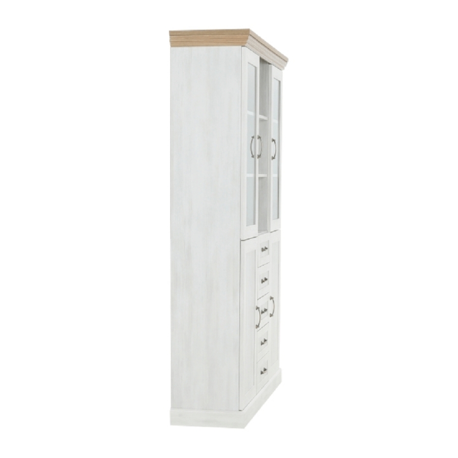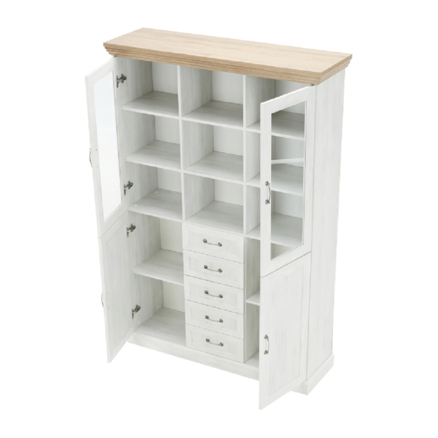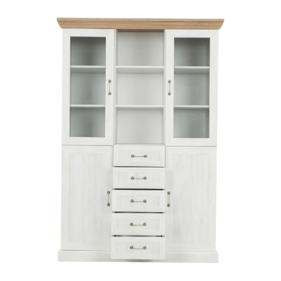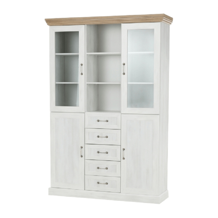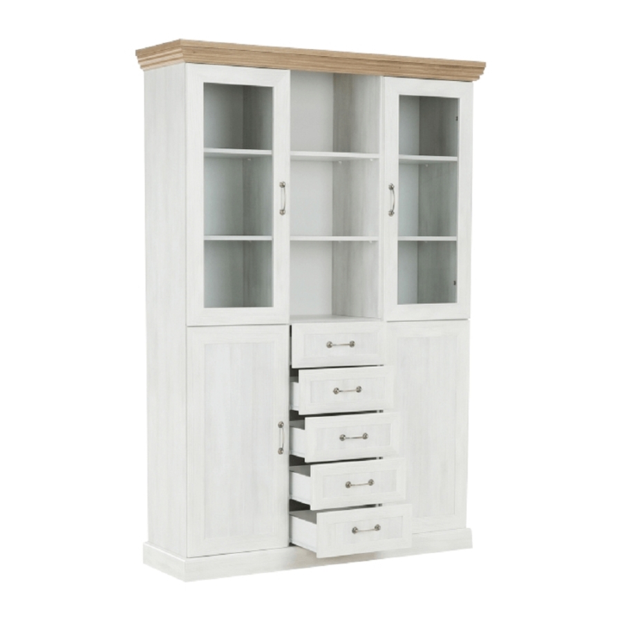 Vitrinszekrény W2D, négy szekrény, öt fiók, nyitott rakodótér polcokkal az elegáns provence-i stílusú ROYAL elemes bútorcsaládból Ideális a nappaliba vagy a hálószobába. Anyag: váz laminált DTD + díszlécek, fém fogantyúk Színváltozat: északi fenyő vad tölggyel kombinálva Méretek (SzéxMéxMa): 127x39x187 cm Váz vastagsága: 15 mm Felsőlap vastagsága: 22 mm Szállítás: lapraszerelten