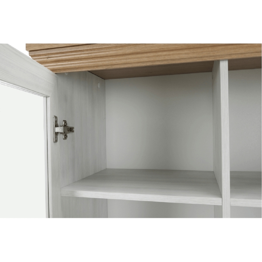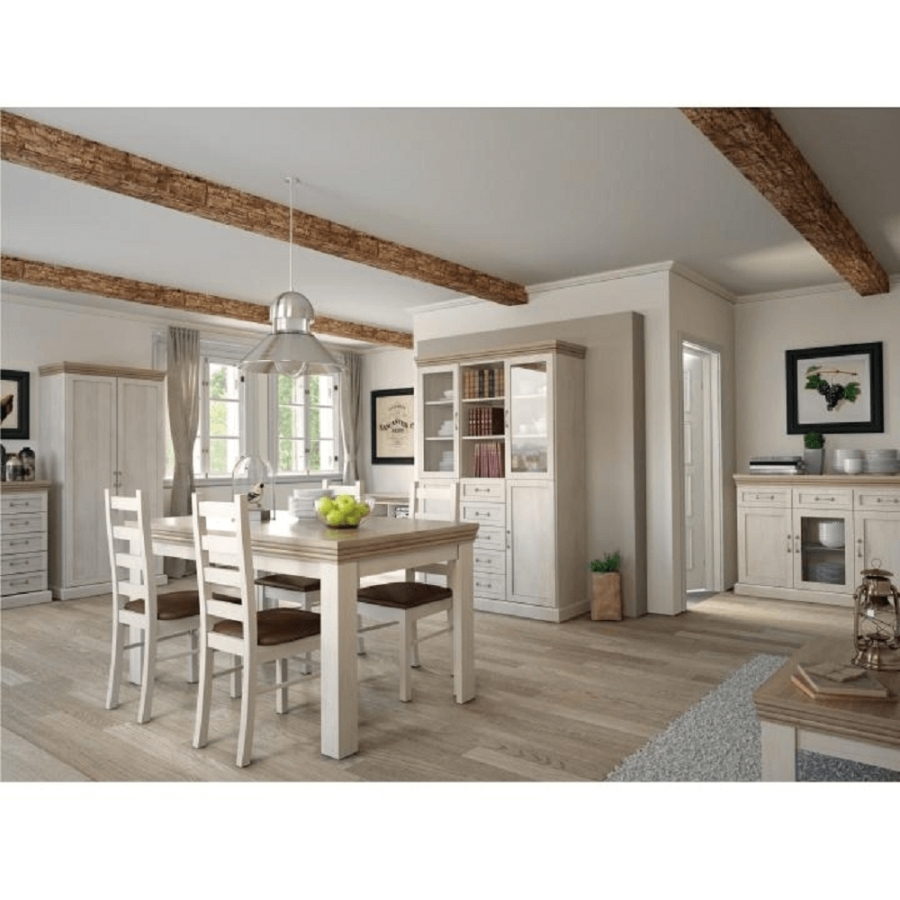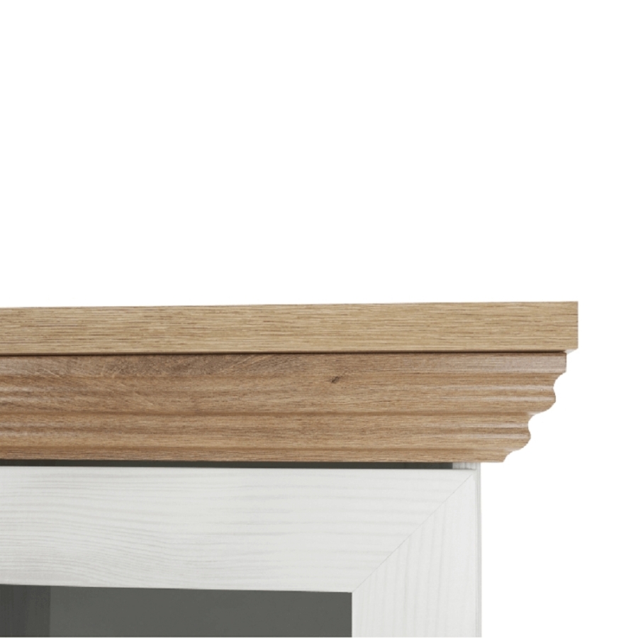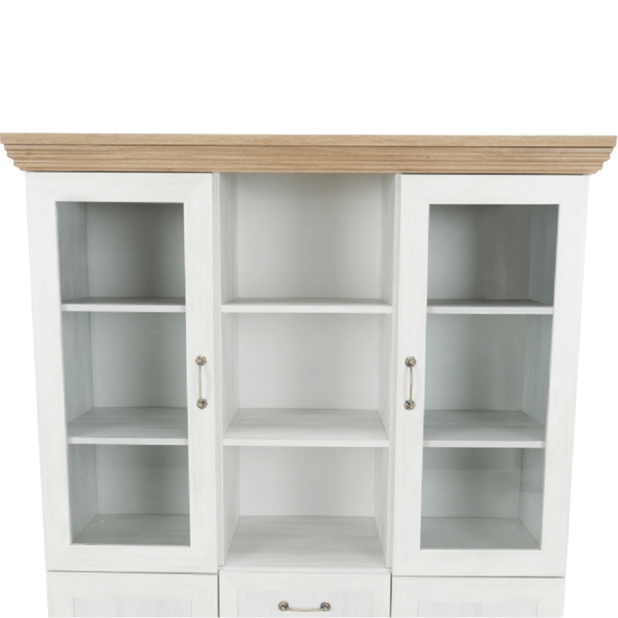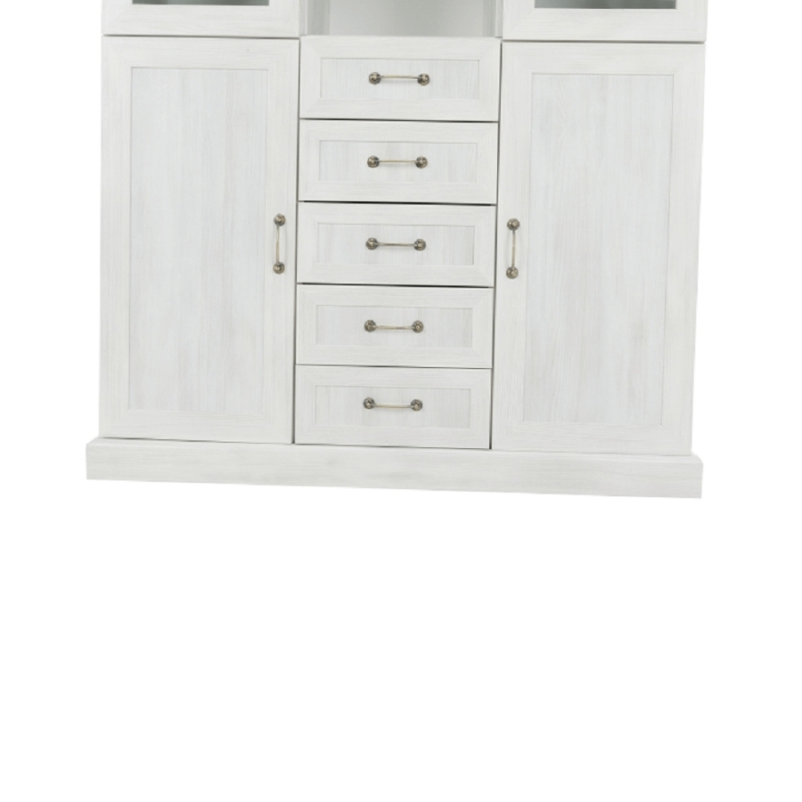 Vitrinszekrény W2D, négy szekrény, öt fiók, nyitott rakodótér polcokkal az elegáns provence-i stílusú ROYAL elemes bútorcsaládból Ideális a nappaliba vagy a hálószobába. Anyag: váz laminált DTD + díszlécek, fém fogantyúk Színváltozat: északi fenyő vad tölggyel kombinálva Méretek (SzéxMéxMa): 127x39x187 cm Váz vastagsága: 15 mm Felsőlap vastagsága: 22 mm Szállítás: lapraszerelten