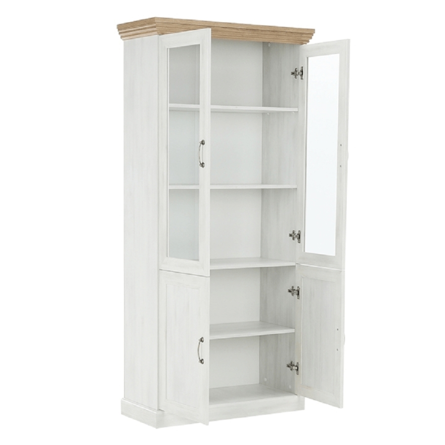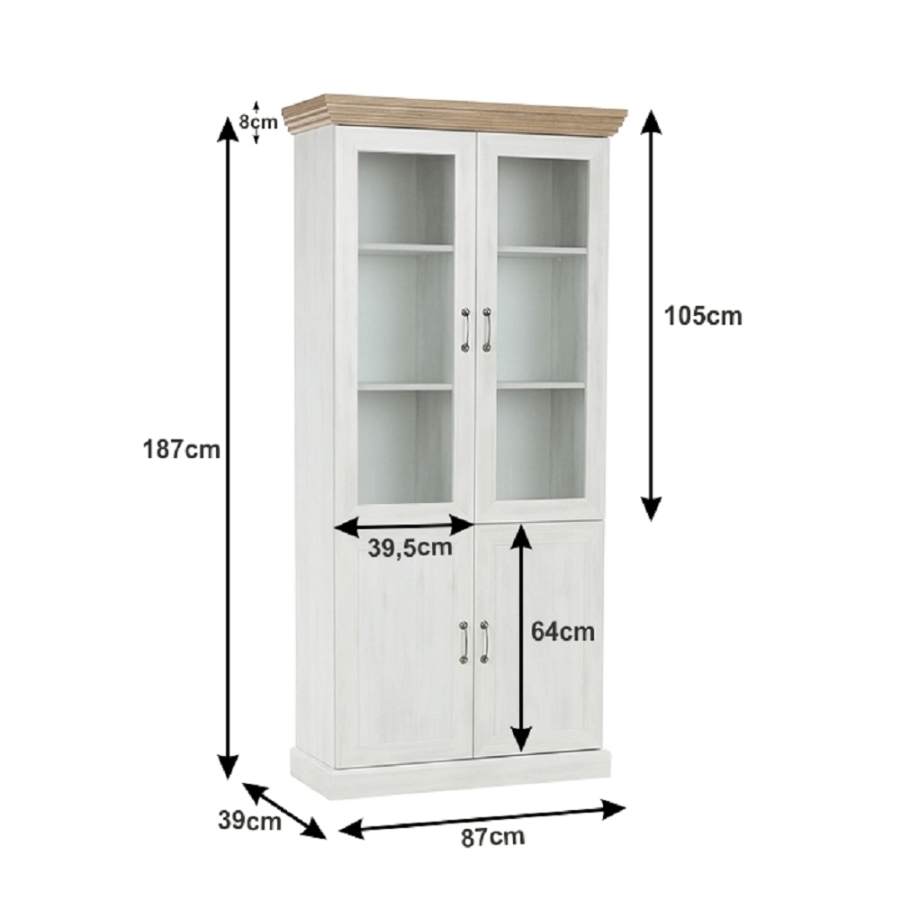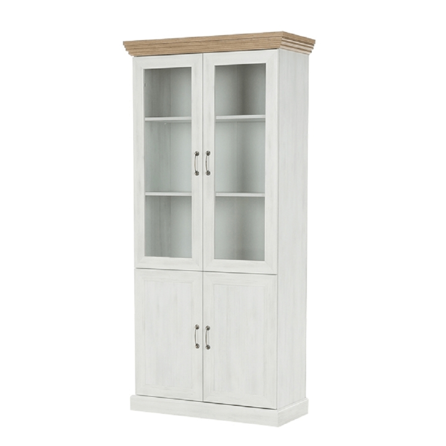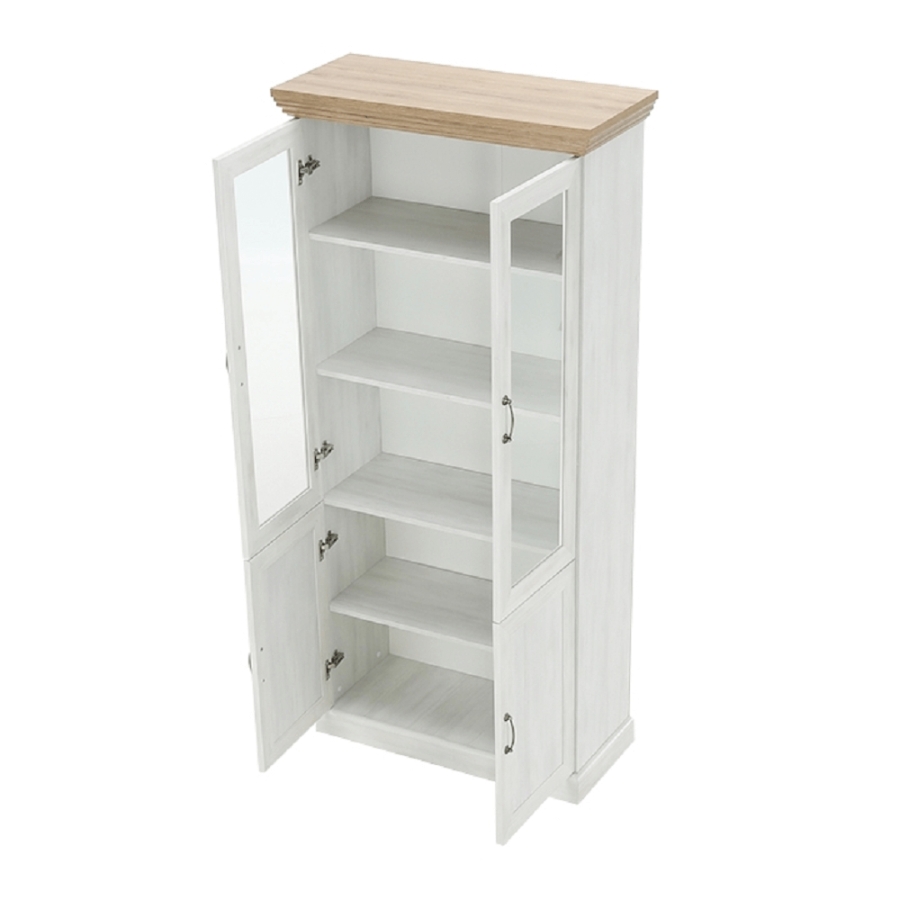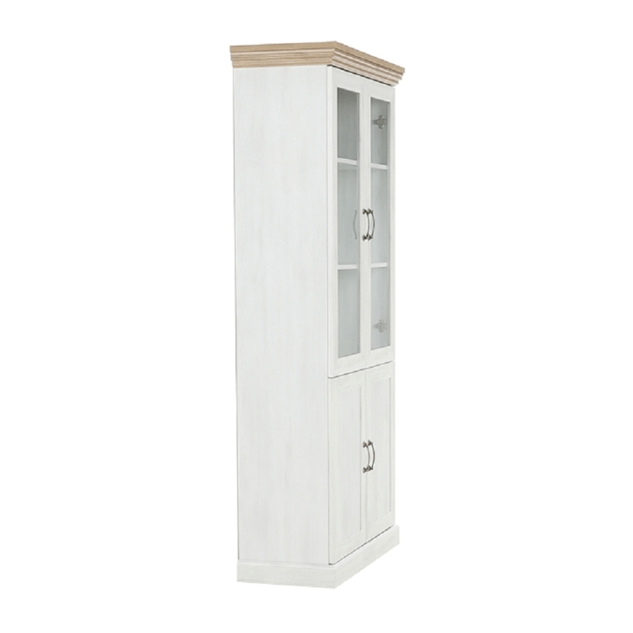 Vitrinszekrény W4D, négyajtós, az elegáns provence-i stílusú Royal elemes bútorcsaládból Ideális nappaliba vagy hálószobába Anyag: váz laminált DTD + díszlécek, fém fogantyúk Színváltozat: északi fenyő vad tölggyel párosítva Méretek (SzéxMéxMa): 87x39x187 cm Váz vastagsága: 15 mm Felsőlap vastagsága: 22 mm Szállítás: lapraszerelten