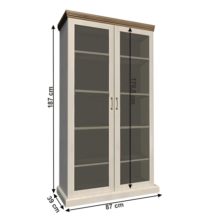Vitrinszekrény WS, kétajtós öt polccal, az elegáns provence-i stílusú Royal elemes bútorcsaládból Ideális nappaliba vagy hálószobába Anyag: váz laminált DTD + díszlécek, fém fogantyúk Színváltozat: északi fenyő vad tölggyel párosítva Méretek (SzéxMéxMa): 87x39x187 cm Váz vastagsága: 15 mm Felsőlap vastagsága: 22 mm Szállítás: lapraszerelten