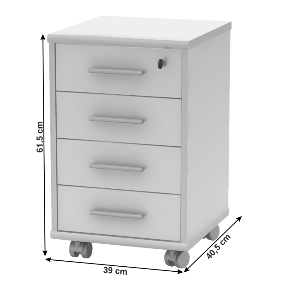 Irodai konténer JOHAN 2 NEW 12 zárral, és négy fiókkal A zár csak a felső fiókhoz tartozik, a többi fiókot nem lehet bezárni Színkivitel: fehér Anyag: laminált DTD Méretek (SzéxMéxMa): 39x40,5x61,5 cm Szlovák termék ABS élek Bontásban szállítva