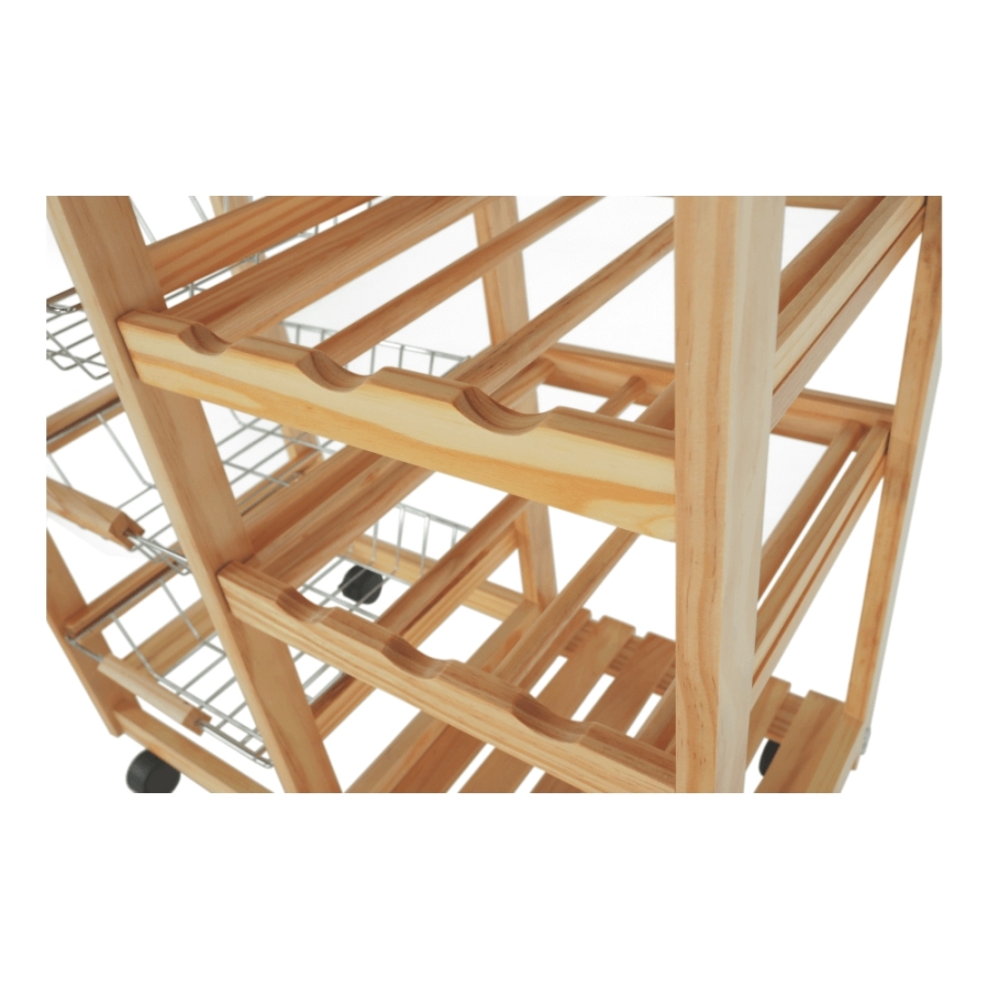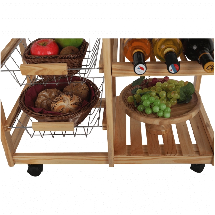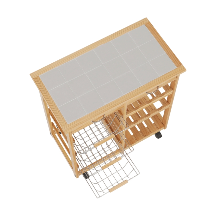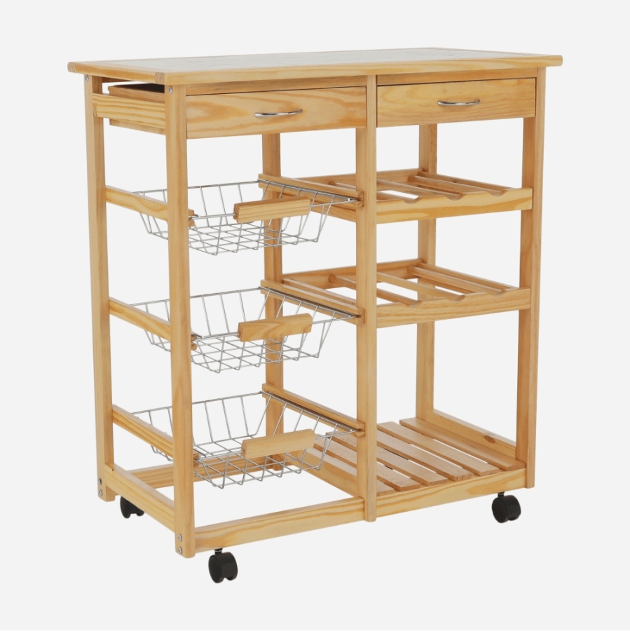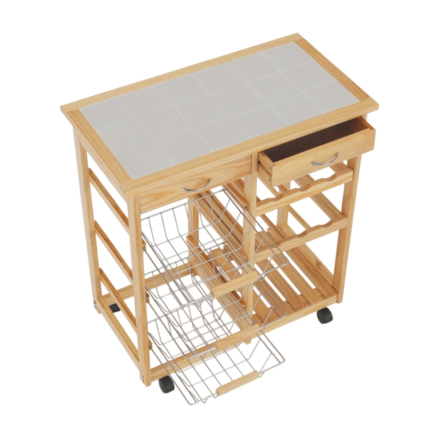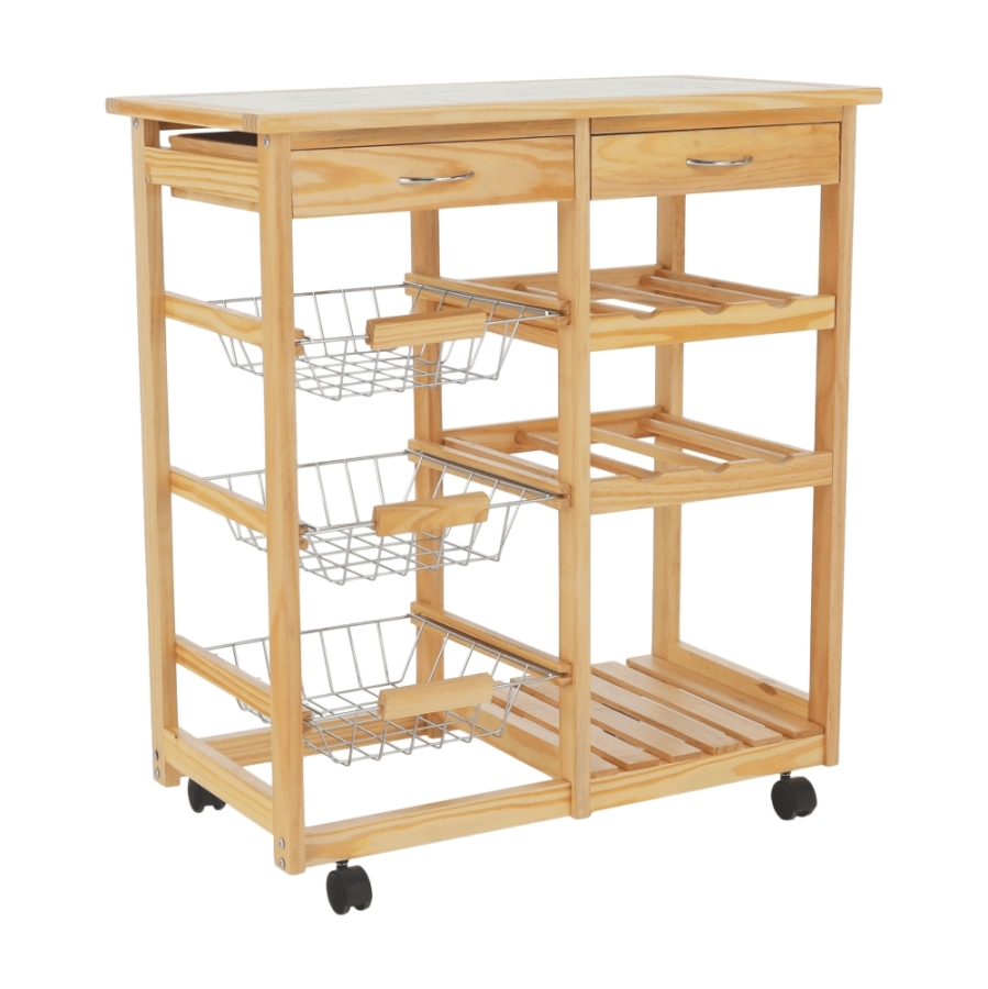 Anyag: kerámia/masszív Szín: természetes Méretek (SzxVxH): 67x37x75 cm 3 fém kosár 2 fiók Nyitott polc 2 polc palackokhoz Kerekeken Bontásban szállítva
