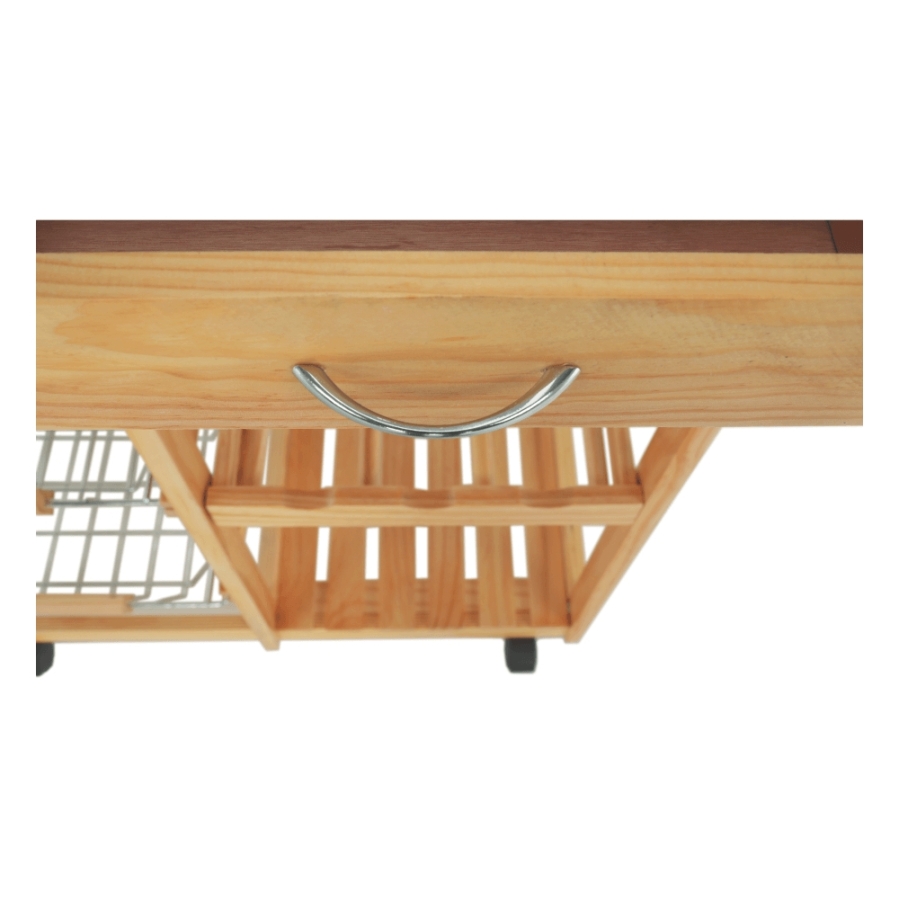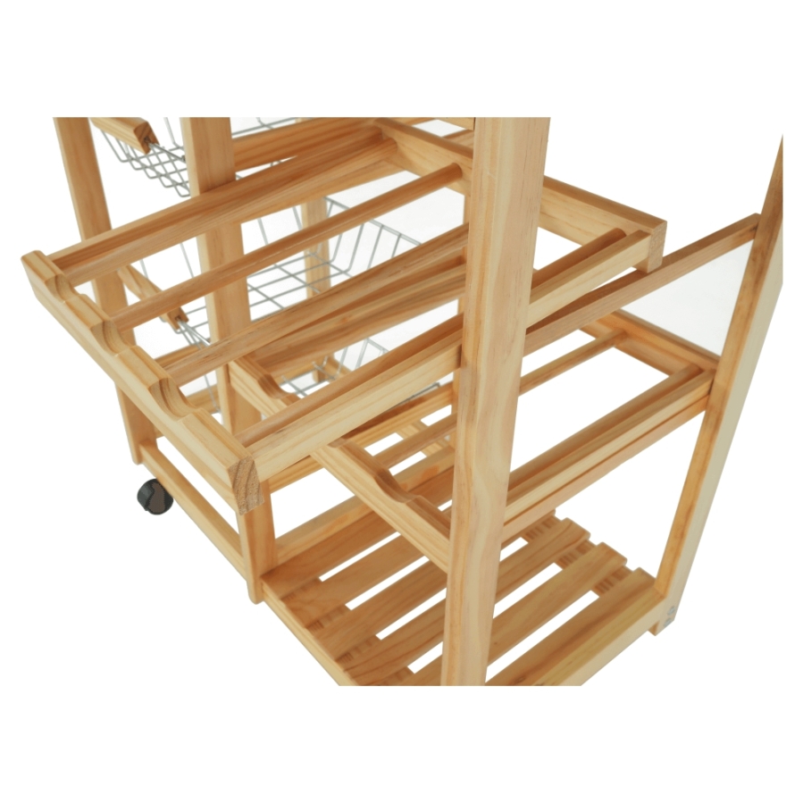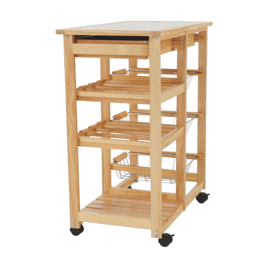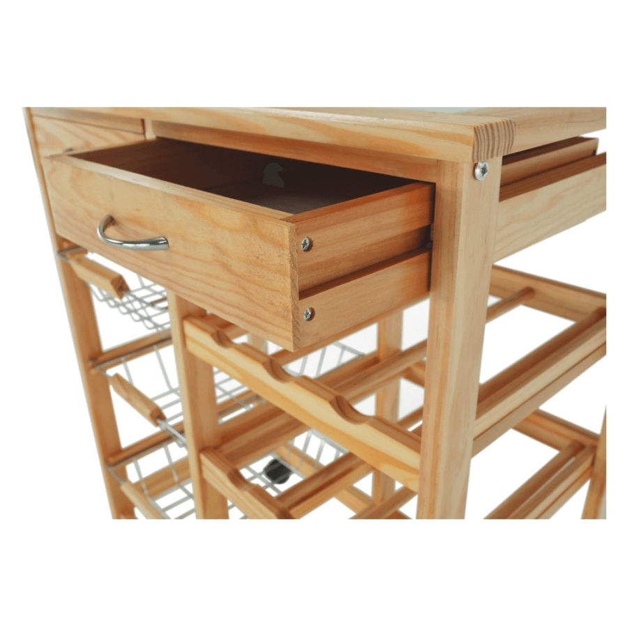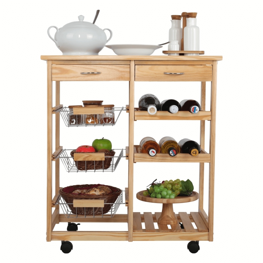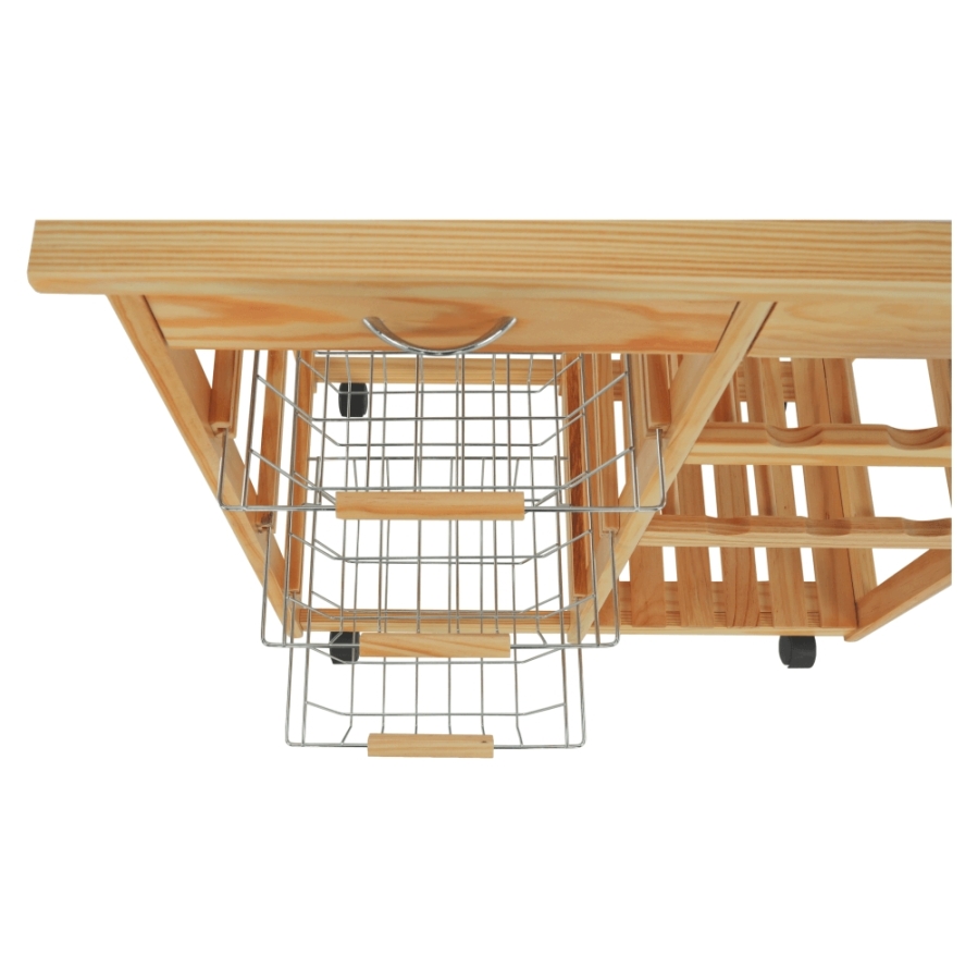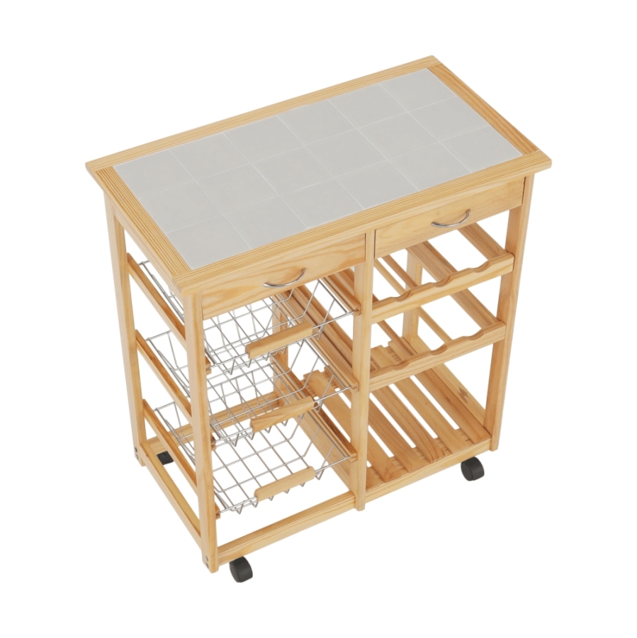Anyag: kerámia/masszív Szín: természetes Méretek (SzxVxH): 67x37x75 cm 3 fém kosár 2 fiók Nyitott polc 2 polc palackokhoz Kerekeken Bontásban szállítva