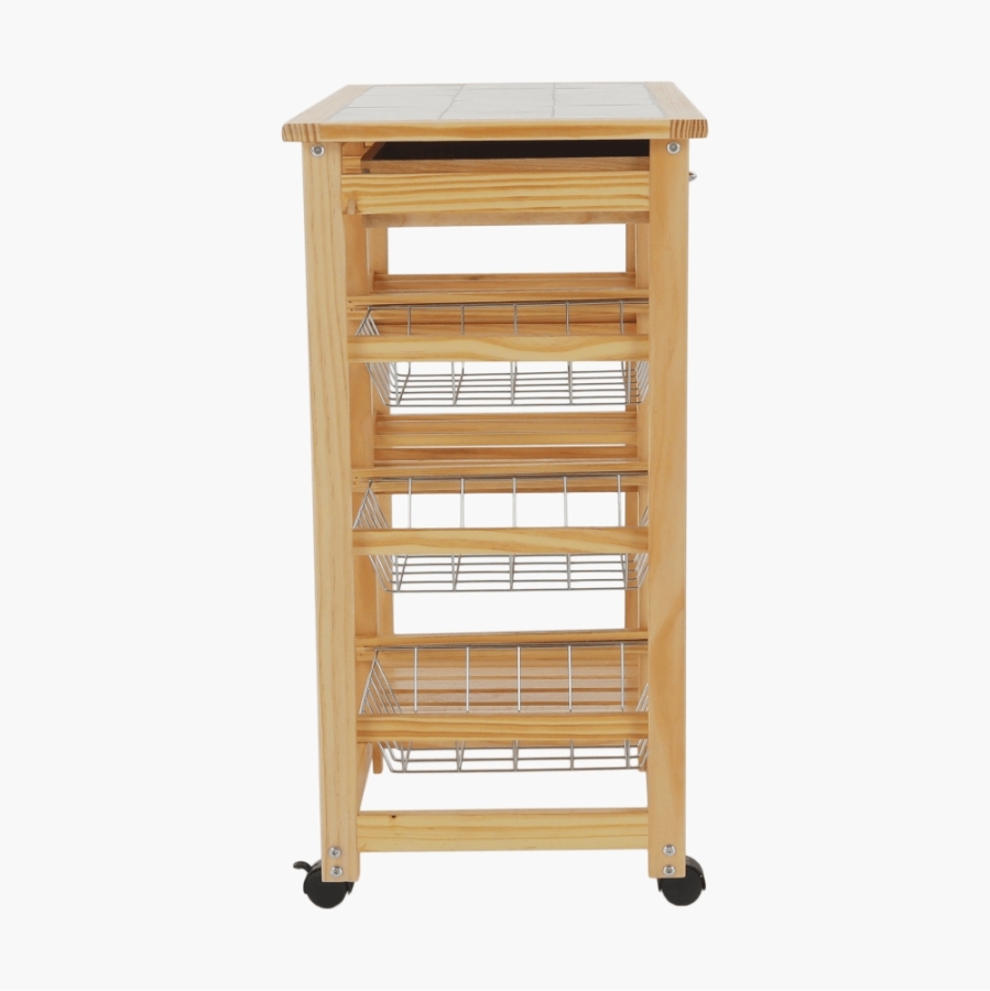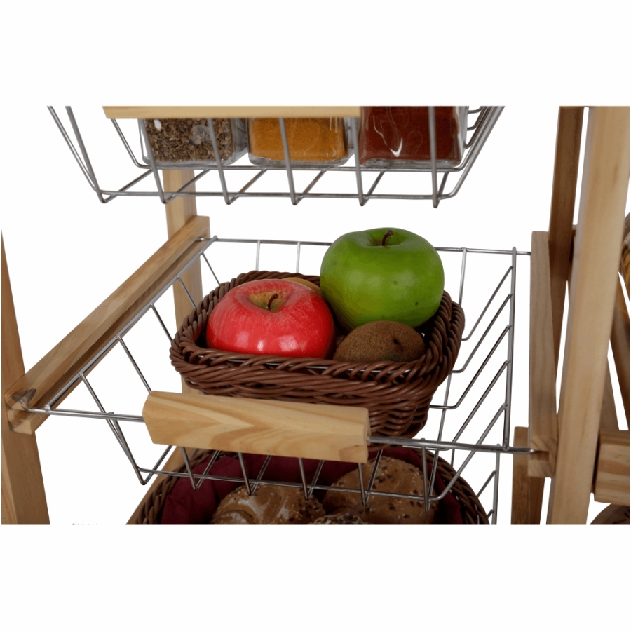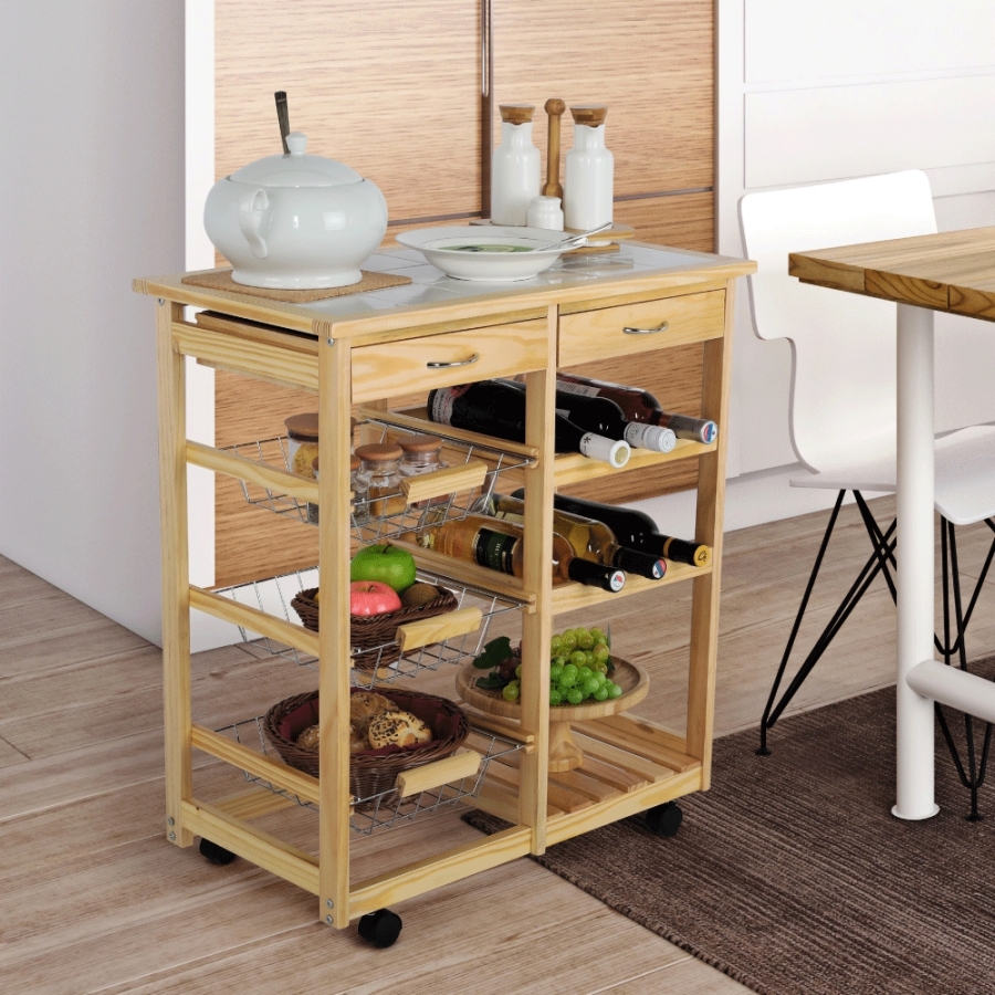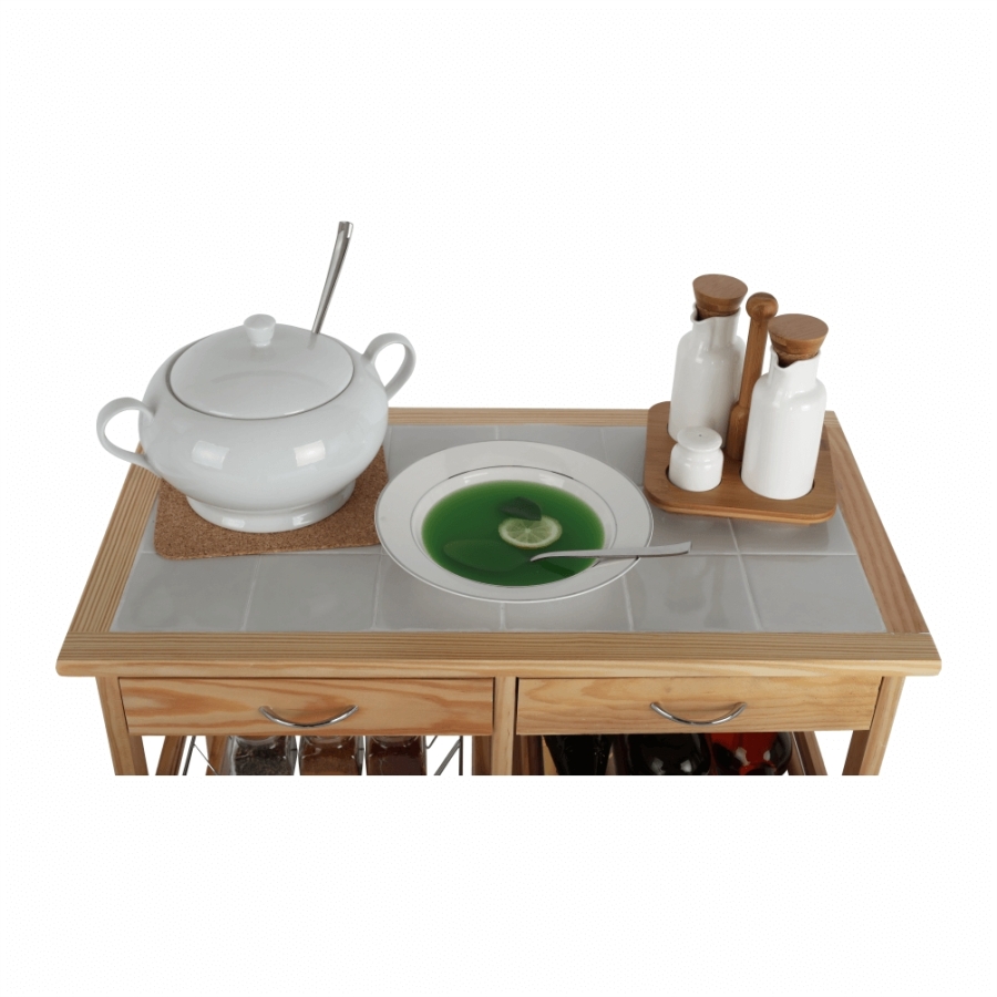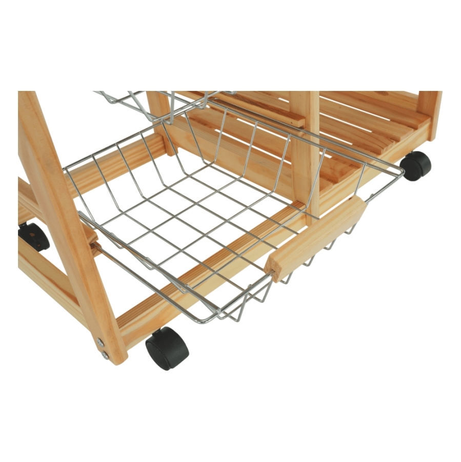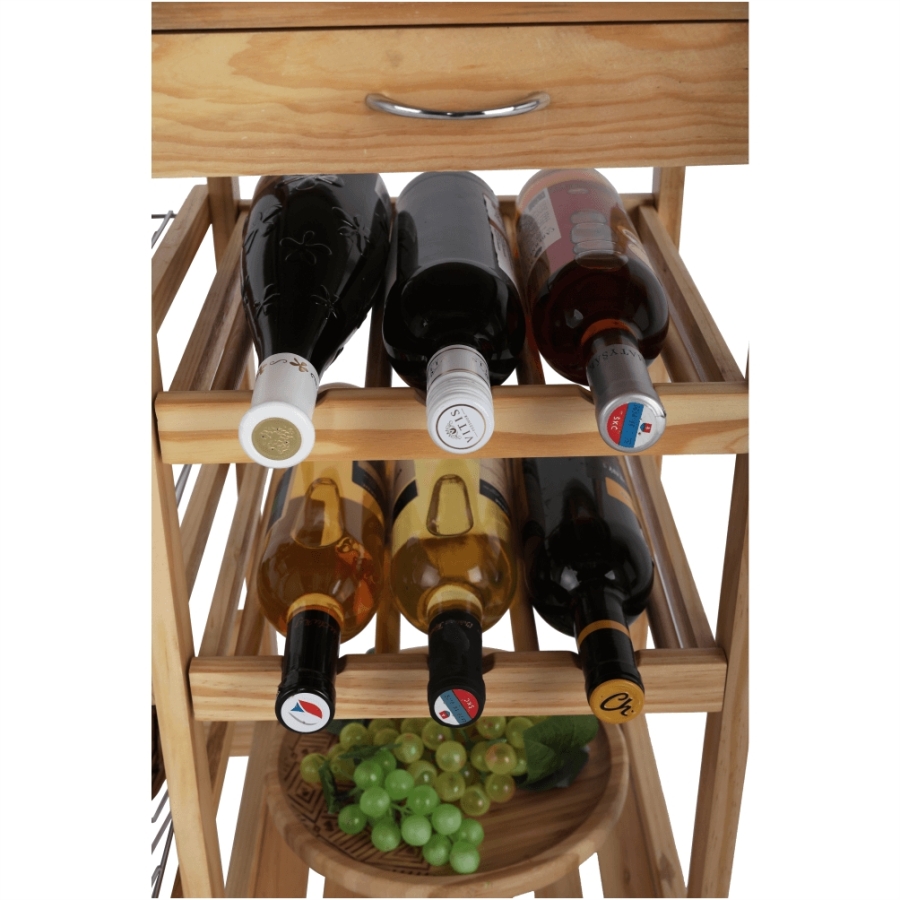 Anyag: kerámia/masszív Szín: természetes Méretek (SzxVxH): 67x37x75 cm 3 fém kosár 2 fiók Nyitott polc 2 polc palackokhoz Kerekeken Bontásban szállítva